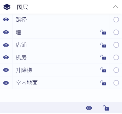 上图便是图层栏的示意图,从其中可以看出当前地图一共拥有8个图层,每个图层的最左边都有一个暗色的小眼睛,点击小眼睛可以控制该图层的显隐;除了路径层之外其余每个图层后面都会跟一个解开的锁的图标,点击这个图标便可以控制当前图层的锁定与解锁;最右边一个单选框可以控制当前图层的选中,该按钮可以控制该图层所有区块的选中情况。